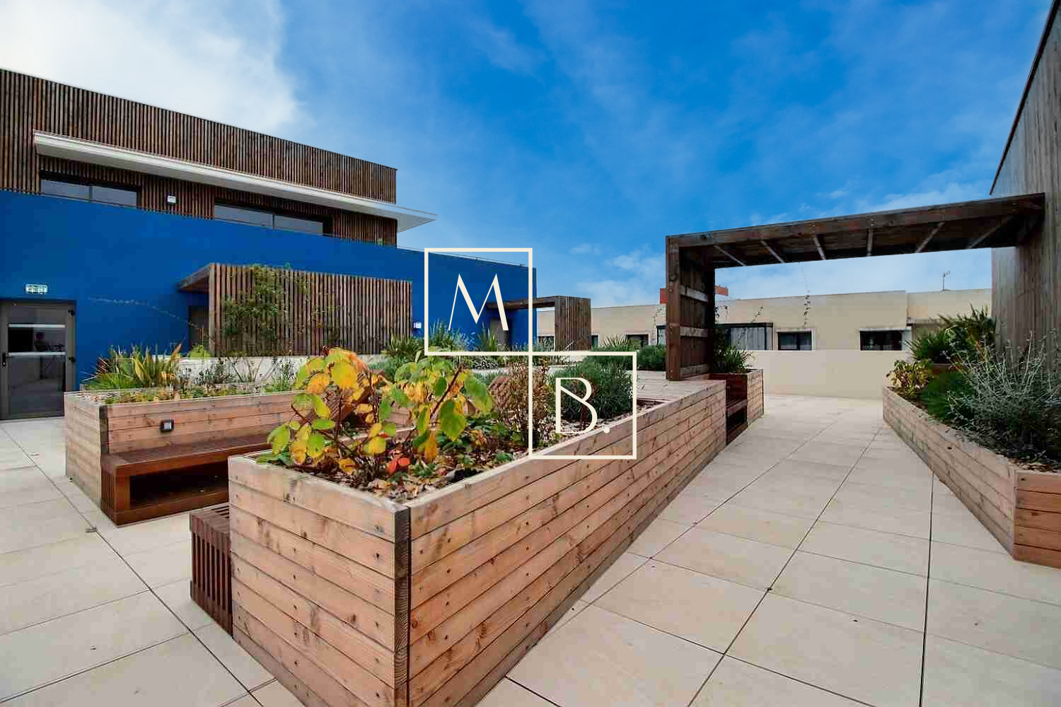 Le + de l'appartement : un accès à une terrasse partagée sur le toit de l'immeuble pour les résidents avec une vue dégagée et arborée, vélos électriques à disposition, borne de recharge pour voiture électrique, plusieurs locaux à vélos.