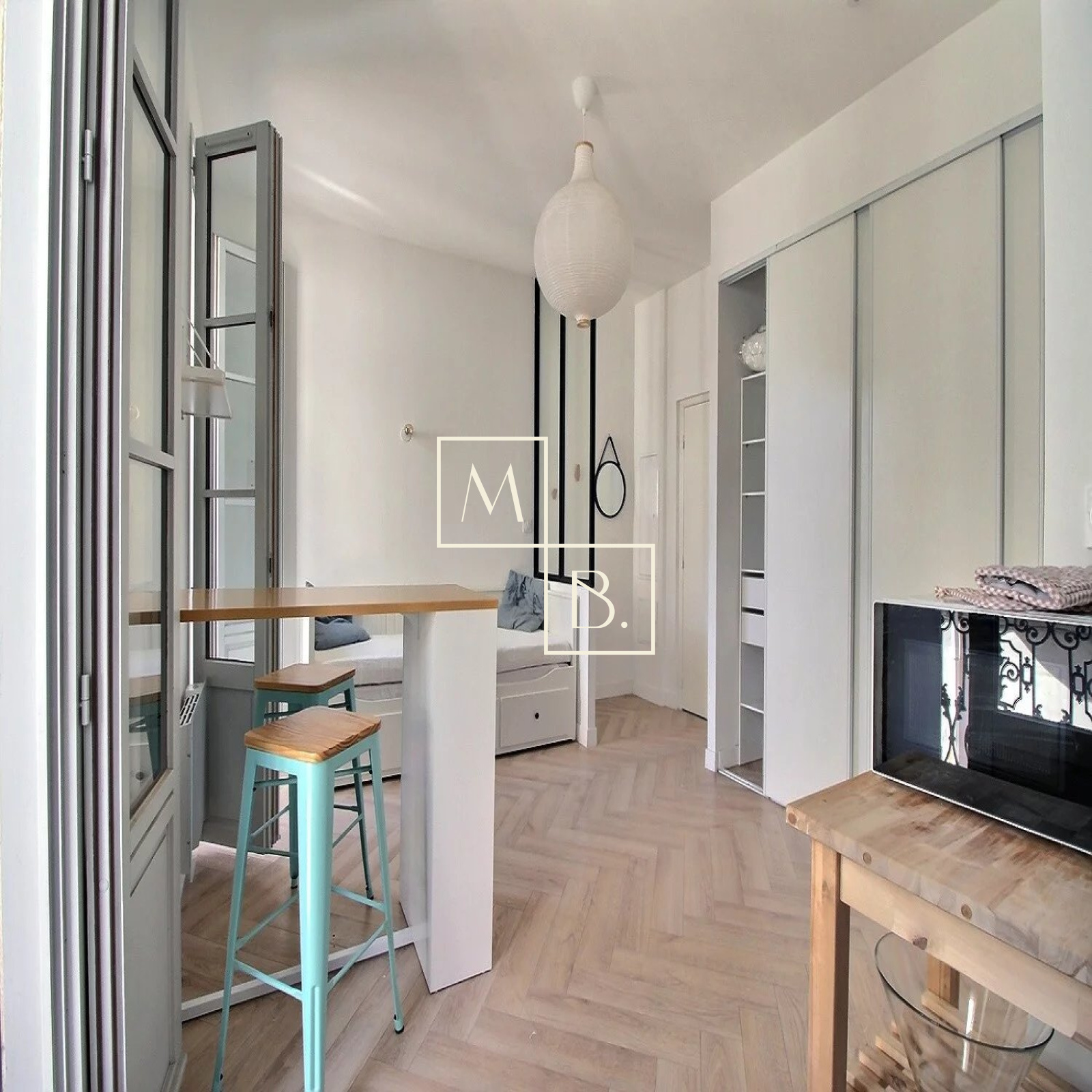 Appartement T1 meublé en très bon état de 21,58m² habitable, situé au 1ème étage sans ascenseur et comprenant: une pièce de vie lumineuse, grand placard (avec machine à laver), coin cuisine aménagée/équipée (plaque, hotte, four et frigo) donnant accès à deux petits balcons et une salle de douche avec WC.