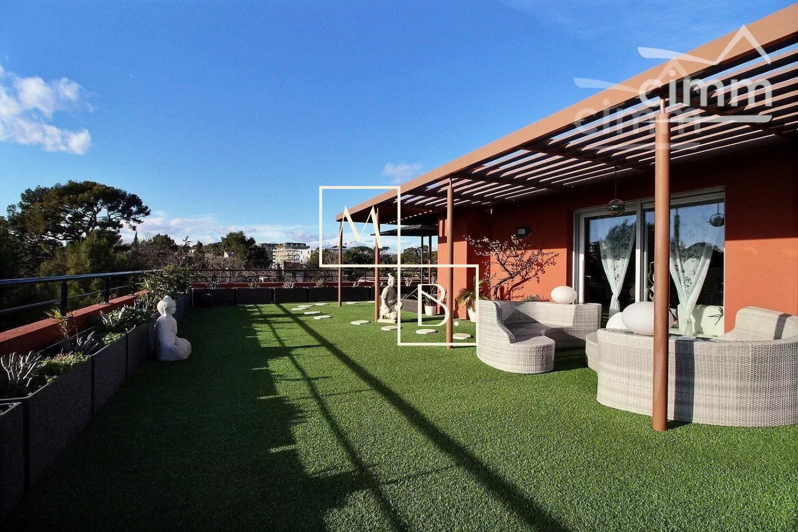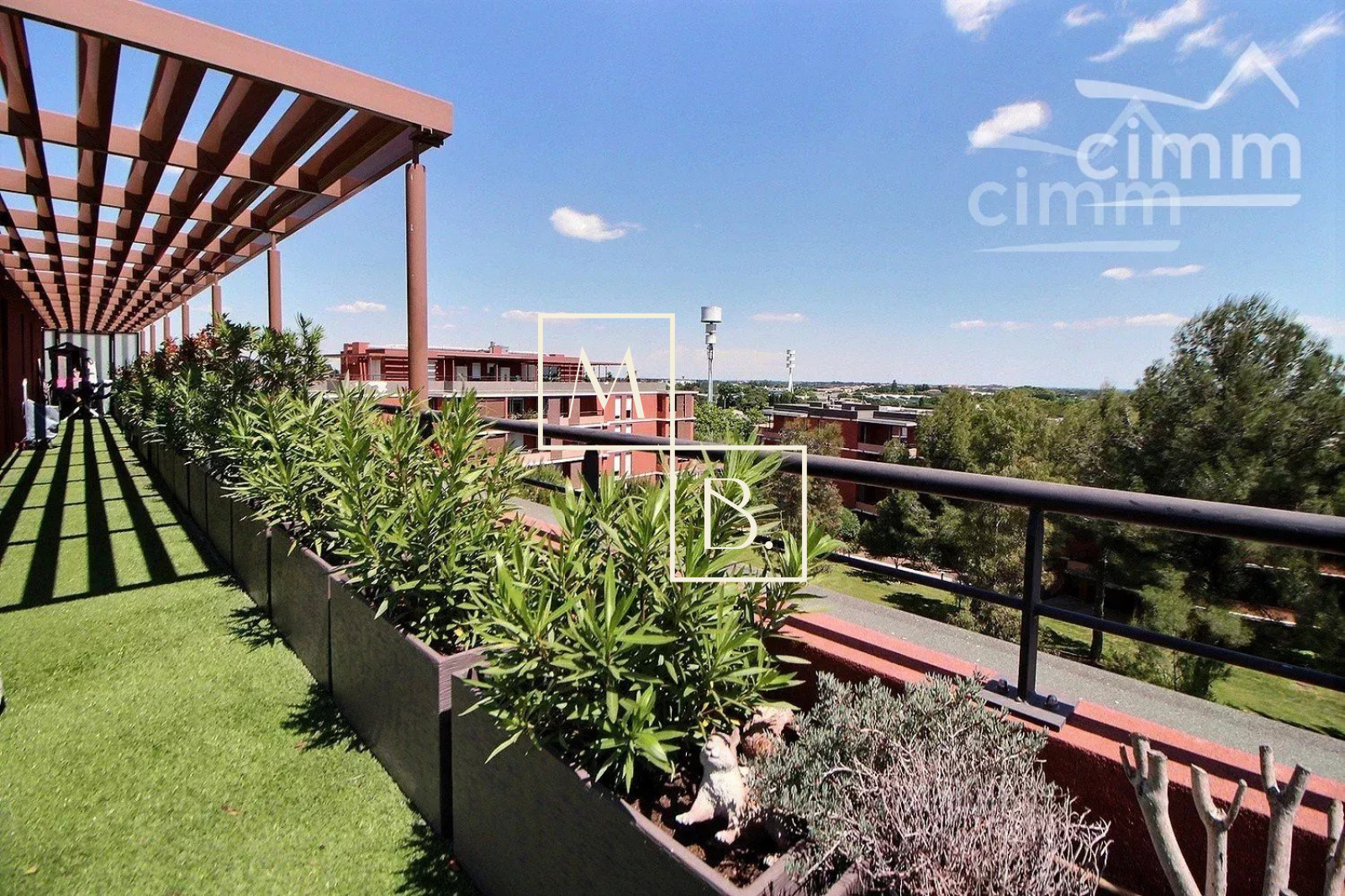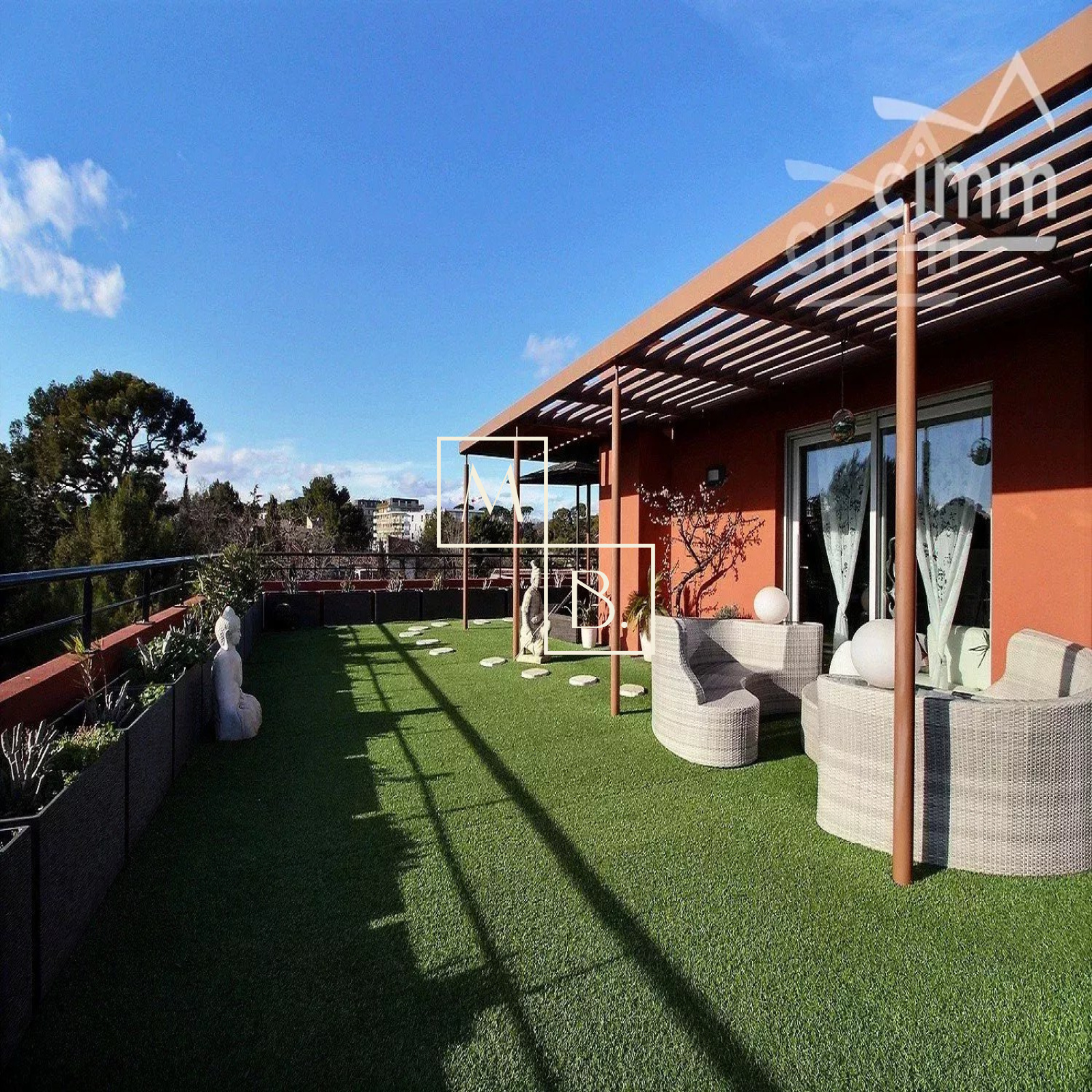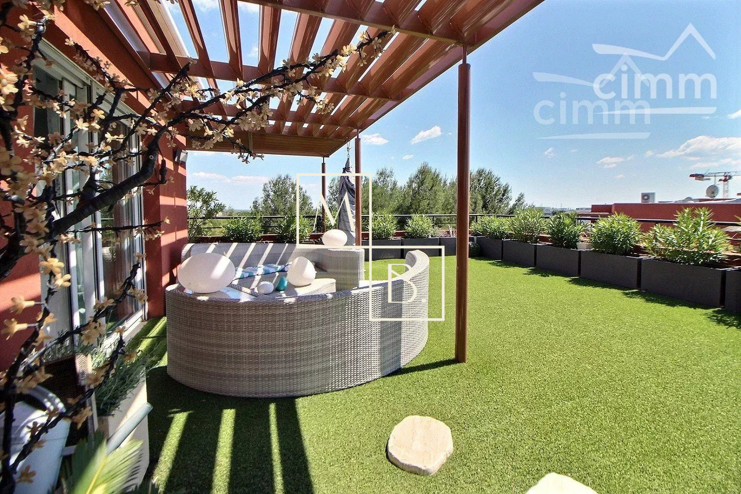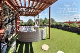 A VENDRE, Montpellier, UNIQUE et RARE, secteur Marquerose limite Les Grisettes, toît terrasse, appartement T5 d'exception de 106 m2 avec terrasse de 136 m2 et vue panoramique ! Situé à 5 min à pied de la ligne 2 du Tramway, arrêt Les Sabines, en liaison directe avec le Centre historique et la gare St Roch et à quelques minutes des commodités. Accès proche de l'autoroute et plage à 15 min. Résidence verdoyante et de standing pour cette construction de 2011, entièrement sécurisée et avec accès par visiophone. Situé au dernier étage avec ascenseur, cet appartement de caractère et UNIQUE sur Montpellier se caractérise par de grands espaces de vies ouverts sur une généreuse terrasse ! Décoration contemporaine, soignée et de très grande qualité, ce bien est spacieux et lumineux. Bien agencé, il comprend : une vaste entrée avec placard/penderie, une buanderie, un double séjour de 35 m2 avec doubles baies vitrées coulissantes donnant accès à la terrasse, une cuisine indépendante haut de gamme, entièrement aménagée et équipée (plans en marbre, plaque de cuisson induction, hotte, four, frigo américain, lave vaisselle, micro-onde), un WC séparé, une suite parentale avec placard et accès privatif à une salle de bain + douche + WC, 2 autres chambres dont une avec placard et une salle de douche à l'italienne. Prestations haut de gamme : chauffage/climatisation reversible centralisé, menuiseries PVC blanc double vitrage, volets roulants électriques, fibre optique, carrelage, vidéophone, alarme. MAGNIFIQUE terrasse de 136 m2 avec gazon synthétique, décoration florale, plantes, barbercue, pergoala sans aucun vis-à-vis et bénéficiant d'une triple exposition (Est, Sud et Ouest). 3 stationnements de voiture : garage double fermé de 20 m2 en sous-sol sécurisé et place de parking. Bien soumis au statut de la copropriété comprenant 152 lots d'habitations. Montant moyen annuel de la quote-part du budget prévisionnel à la charge du vendeur : 2 405 €. Aucune procédure en cours menée sur le fondement des articles 29-1 A et 29-1 de la loi n° 65-557 du 10 juillet 1965 et de l'article L. 615-6 du CCH. Honoraires à la charge du vendeur. Votre interlocuteur privilégié : Olivier BIHI, gérant de l'agence Cimm immobilier Montpellier.