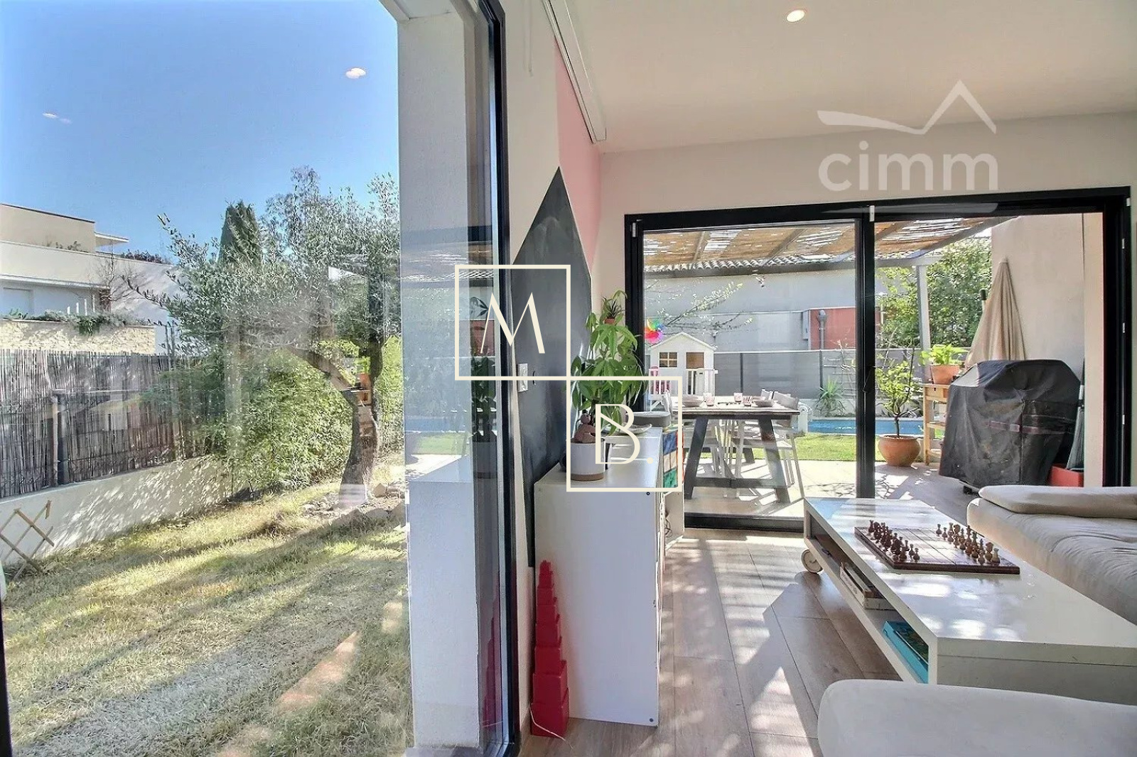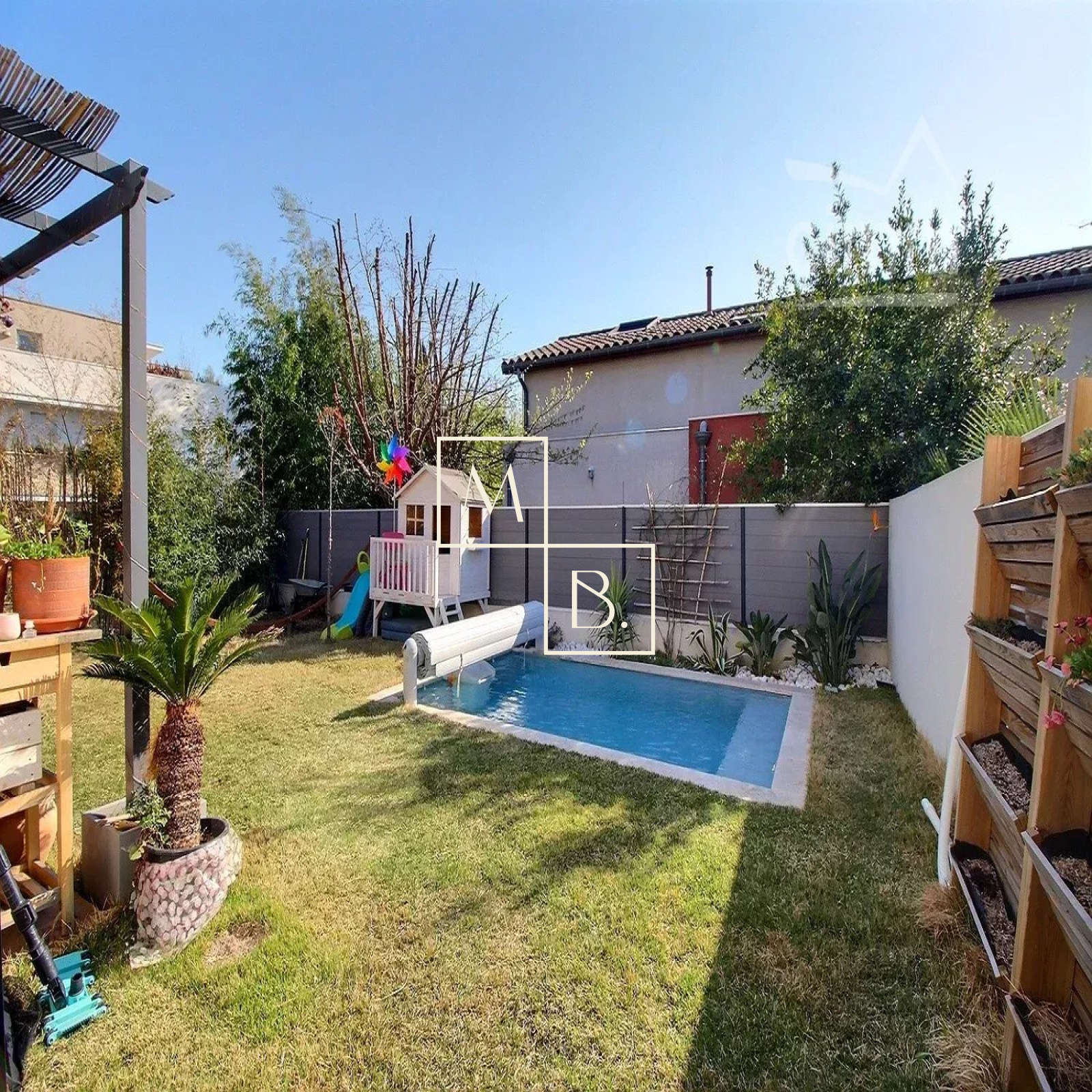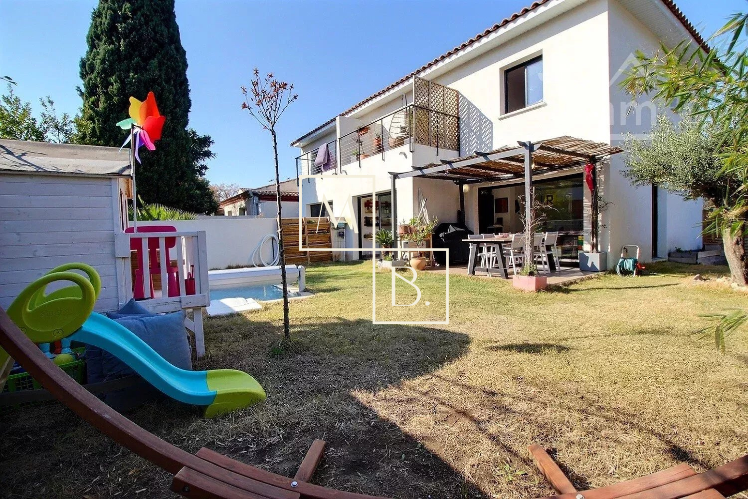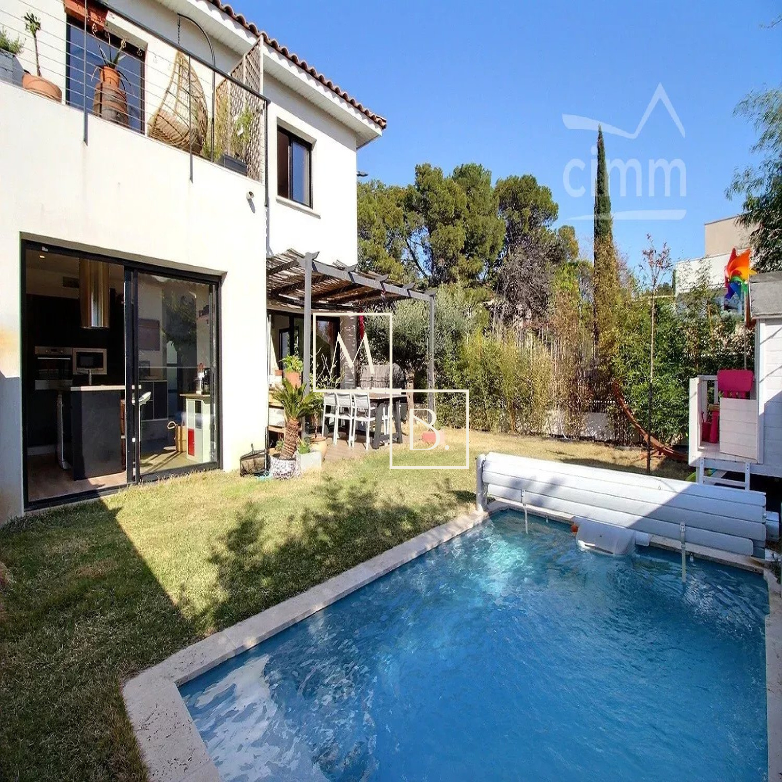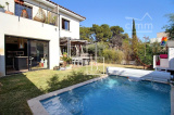 A VENDRE, Montpellier, Croix d'Argent, VILLA récente T4 de 87 m² habitable avec 3 chambres, une piscine et un garage. Situation idéale : à proximité de la ligne 2 du Tram (arrêt Villeneuve d'Angoulême), des commodités et commerces, écoles et grands axes routiers. Construction de qualité de 2018, BBC RT 20212, mitoyenne d'un côté. Exposée sud-ouest et sud-est, maison lumineuse, bien agencée et fonctionnelle qui comprend : - au rez-de-chaussée : entrée sur un vaste séjour de 40 m² avec cuisine ouverte entièrement aménagée et équipée, îlot central, un WC séparé et l'accès au garage de 16 m². - à l'étage : un couloir distribuant deux chambres de plus de 11 m², une salle de bains, un second WC séparé et une belle suite de parentale de 13 m² avec placard/penderie, un espace douche à l'italienne et une terrasse privative de 6 m². Prestations de qualité : baie vitrée coulissante, menuiserie double vitrage alu gris anthracite, climatisation gainable réversible avec thermostat, ballon thermodynamique, panneau solaire. Le tout sur un joli terrain paysagé clos de 217 m² avec terrasse, pergola, piscine Desjoyaux (4x2,5), arrosage automatique, jeux de lumière... un petit havre de paix... coup de c?ur assuré ! Honoraires à la charge du vendeur. Votre interlocuteur privilégié : Olivier BIHI, gérant de l'agence Cimm immobilier Montpellier.