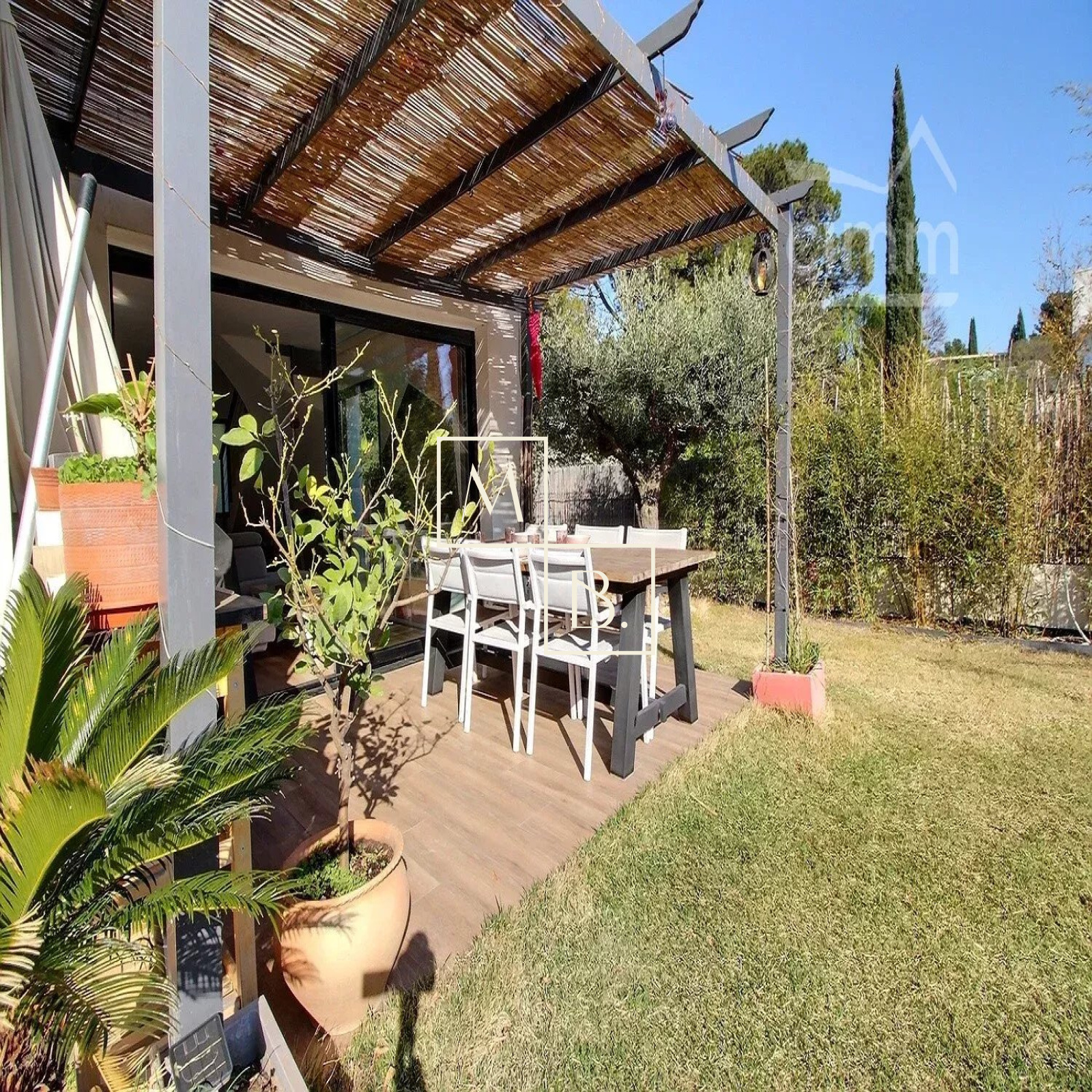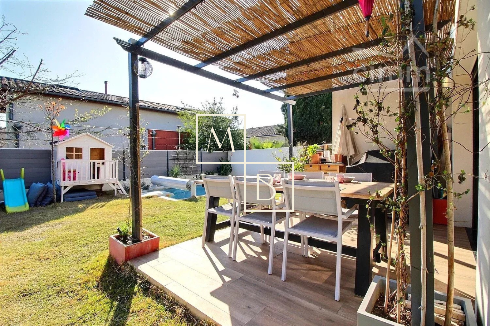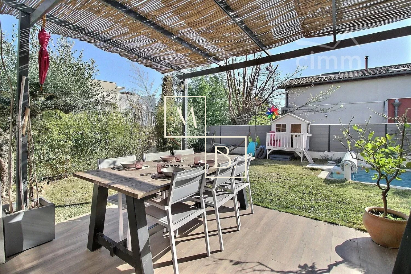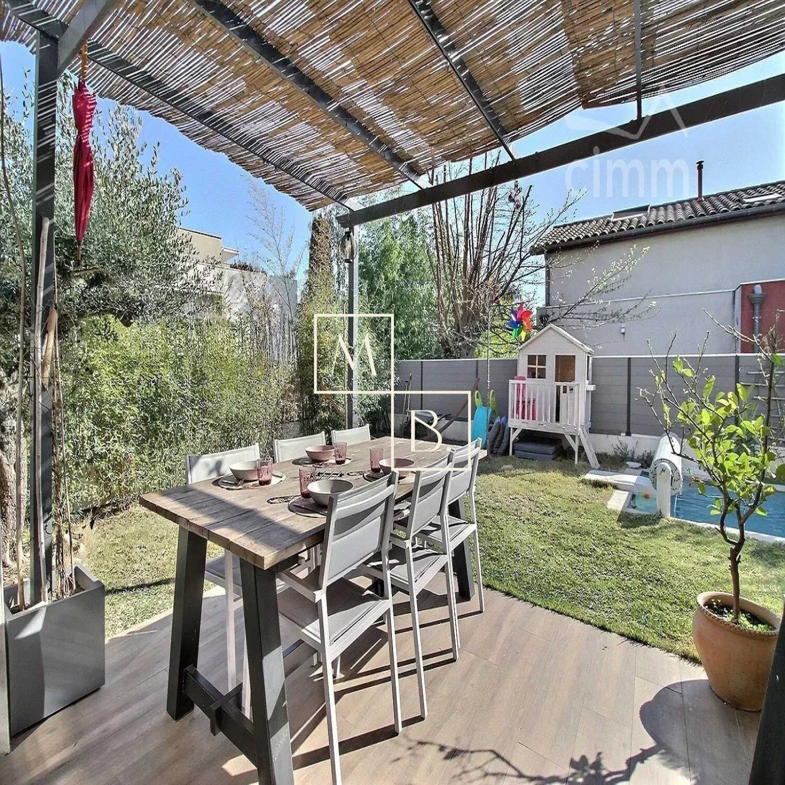 A VENDRE, Montpellier, Croix d'Argent, VILLA récente T4 de 87 m² habitable avec 3 chambres, une piscine et un garage. Situation idéale : à proximité de la ligne 2 du Tram (arrêt Villeneuve d'Angoulême), des commodités et commerces, écoles et grands axes routiers. Construction de qualité de 2018, BBC RT 20212, mitoyenne d'un côté. Exposée sud-ouest et sud-est, maison lumineuse, bien agencée et fonctionnelle qui comprend : - au rez-de-chaussée : entrée sur un vaste séjour de 40 m² avec cuisine ouverte entièrement aménagée et équipée, îlot central, un WC séparé et l'accès au garage de 16 m². - à l'étage : un couloir distribuant deux chambres de plus de 11 m², une salle de bains, un second WC séparé et une belle suite de parentale de 13 m² avec placard/penderie, un espace douche à l'italienne et une terrasse privative de 6 m². Prestations de qualité : baie vitrée coulissante, menuiserie double vitrage alu gris anthracite, climatisation gainable réversible avec thermostat, ballon thermodynamique, panneau solaire. Le tout sur un joli terrain paysagé clos de 217 m² avec terrasse, pergola, piscine Desjoyaux (4x2,5), arrosage automatique, jeux de lumière... un petit havre de paix... coup de c?ur assuré ! Honoraires à la charge du vendeur. Votre interlocuteur privilégié : Olivier BIHI, gérant de l'agence Cimm immobilier Montpellier.